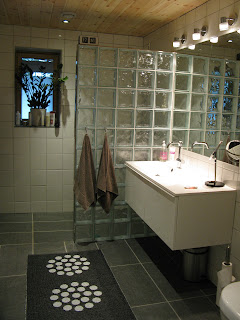 Badet oppe. Skal legges fliser på gulv og bygges opp dusjnisje av glassbyggestein her.