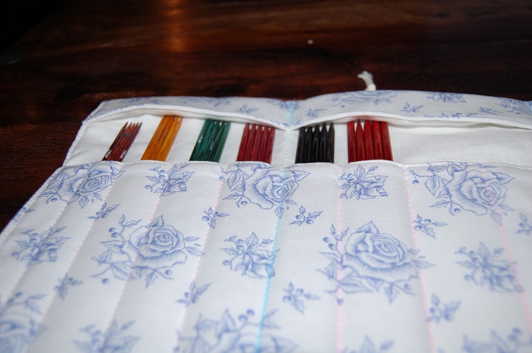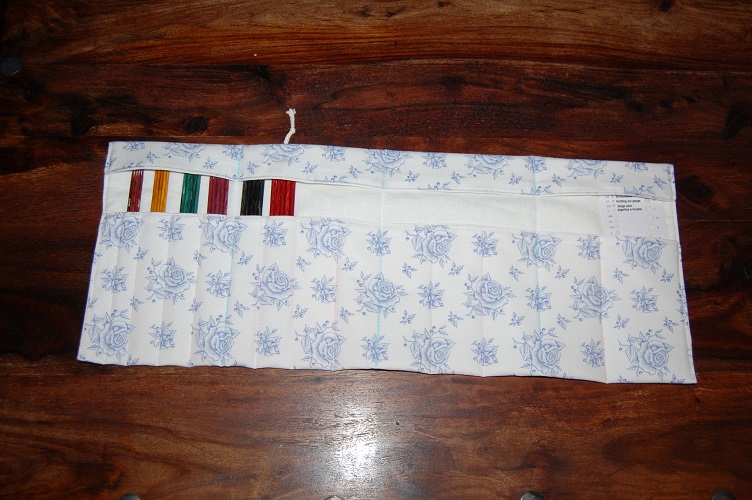 Mappe til rundpinner sydd til MaritK. Mappa har 10 lommer og det er plass til flere pinner i hver lomme.