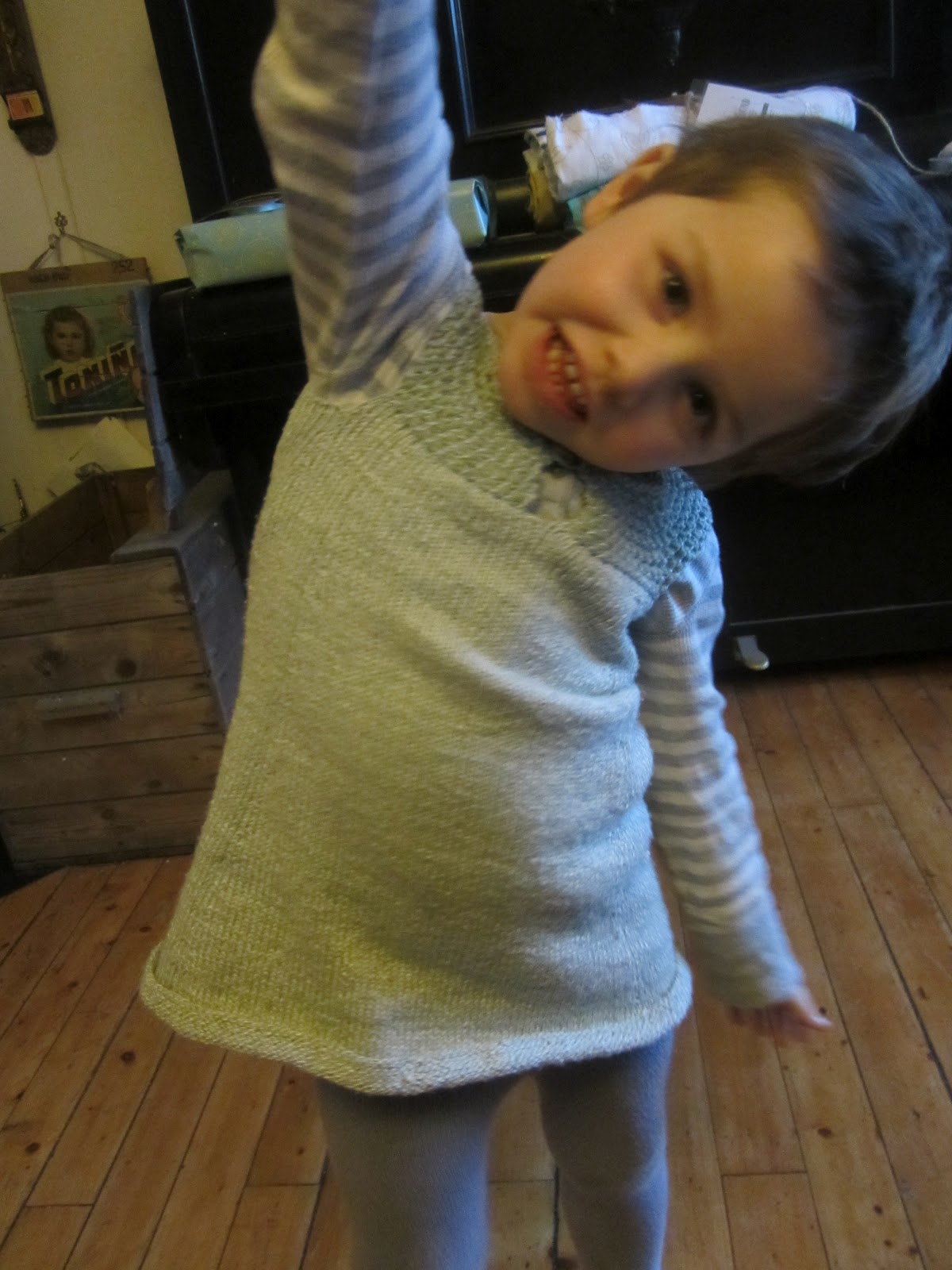 [LEFT]Jeg strikket en liten finkjole etter oppskrift fra Pickles. Veldig fin, men desverre akk så liten. Jeg VET jeg strikker stramt, så jeg burde ha gått opp på pinnestørrelsen. Str. 3-4 ble mer som str. 2 gitt. Men jeg var litt ivrig etter å få brukt det aldeles fantastiske garnet. Silke og kashmir, det rant gjennom fingrene.