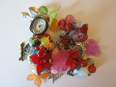 Er det ikke utrolig fint med en sånn bunt med farger og fjas?? Bunten består av tre klokker og et halskjede. Klokkene har fått et slags skogstema - jeg har kjøpt de fineste plastbladene og -blomstene.