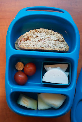 Dagens ikke-fotograferte inneholder en pizzabolle (svinekjøttdeig), tomatsaus er der litt, men det var rå tomat som var fy-fy. Noen få druer, for LITT rå frukt og grønnsaker var greit, og atter en gang brødskive med brunost. Nå er det jo heldigvis brunost han har lyst på da, men jeg pleier jo forsøke å variere litt bort fra det han har lyst på ved å tilby og friste med andre ting...