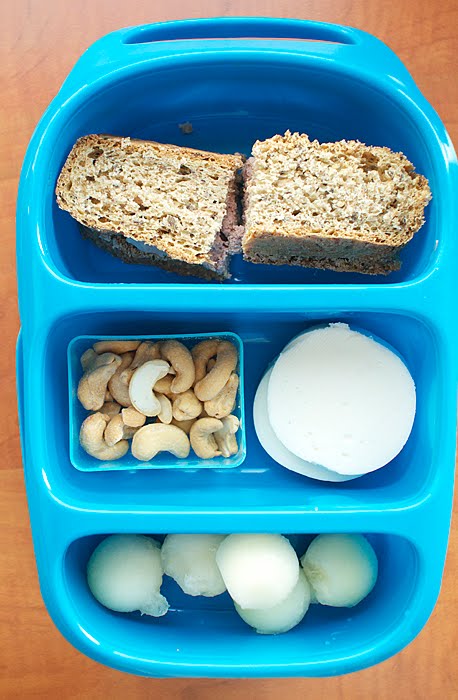 Anywho, her er dagens: Grove kanelpannekaker (rester fra middag, spedd ut med grovt mel og kanel), osteruller, 1/2 nektarin med kanel og agurkstaver: