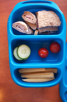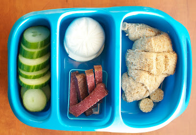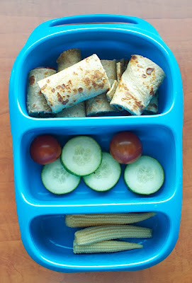 Dagens ble pastaskruer og kjøttboller (av kalkunkjøtt) og brødskive, halve med brunost, halve med skinke og noe hvitost. Ettersom de får et fruktmåltid i barnehagen tenker jeg at "begrenset mengde" ikke bør innebære så mye av det i matpakken i tillegg. Men det blir litt kjipe matpakker...