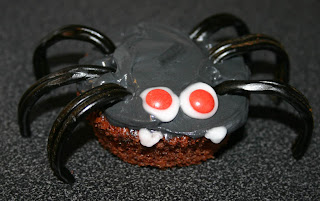 Jeg har farget Eddys sjokoladeglasur med sort konditorfarge. Den ble kjøpt inn før cupcakes ble populært så jeg fant det på Panduro. Nå får du nok kjøpt farge overalt. :jupp: Det hvite er melis, mini-smarties til øyne og "lakrisruller" (eller snører) til bein.
