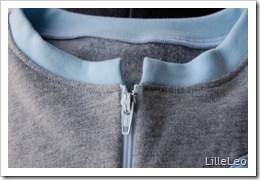Jeg var usikker på hvordan jeg skulle gjøre det med ribben i halsen. Jeg sydde den på etter at glidelåsen var montert. Neste gang kommer jeg enten til å sy på ribben først og/eller skrå den ned mot glidelåsen på enden der, jeg syntes kanten ble litt rar og dominerende.