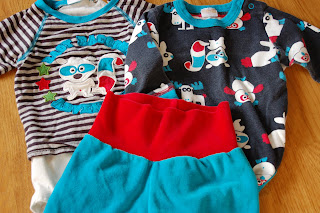 Denne er i str 98. Det er det første plagget jeg har sydd sammen med så og si bare overlock, og det ble bra! Sømmene buler ikke lenger. :D Stoffet på applikasjonen er fra Stoff og stil, knappen er gammel. Jeg har brukt en mørkere grå tråd på kantebåndene.
