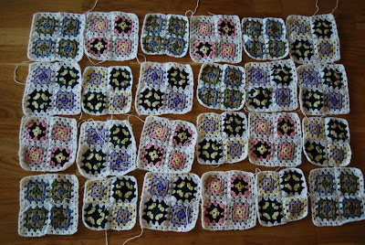 Det skal hekles kanter rundt hver av disse rutene igjen før det kantes rundt hele teppet. Har kommet litt lenger siden bildet ble tatt heldigvis.