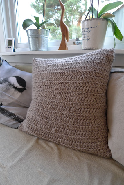 Har heklet putetrekk. Brukte omtrent 6 nøster Eskimogarn og pinne 10. Veldig enkelt og kjapt. Skal vise dere baksiden når jeg får sydd i knapper, den blir ganske fin i lukningen.