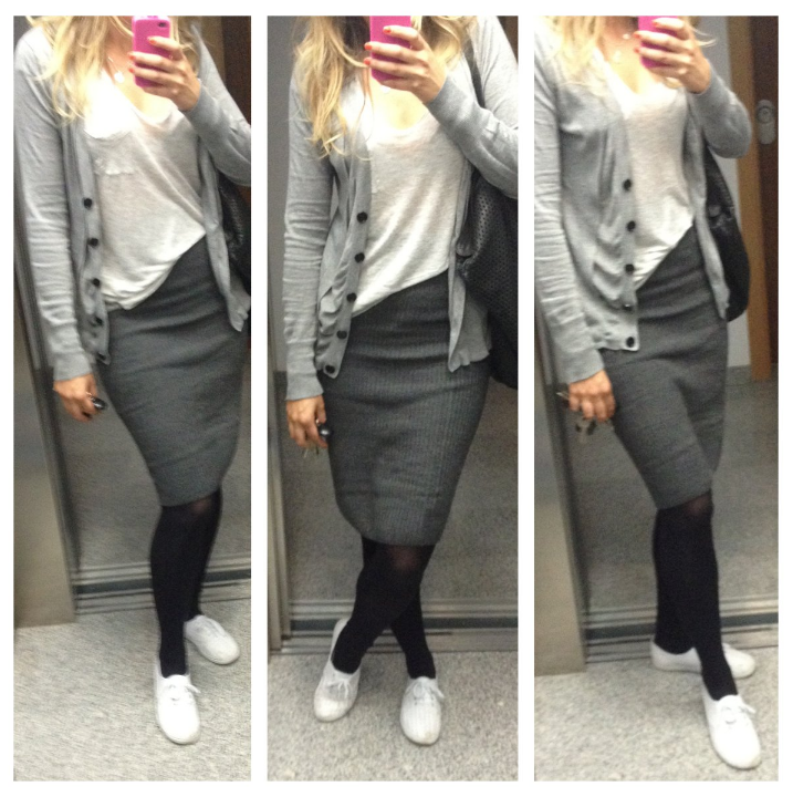 Jeg måtte legge på ti år i klesstil for å få noe kred da jeg begynte å jobbe, og endte med hverdagskjoler i en ganske klassisk stil med cardigan over. Når jeg skal på noe viktig, bytter jeg ut cardiganen med en dressjakke-aktig sak og sorte, diskrete Nike med noe mer i retning av skoene dere viser bilde av.