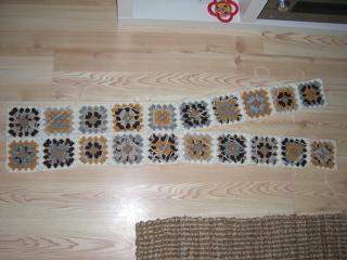 Strikker ikke akkurat, men etter vennlige påminnelser fra mannen, skal jeg endelig ta meg sammen og sy sammen resten av rutene i dette teppet. Det er over 7 (hvor blir tiden av egentlig?!) år siden jeg heklet rutene og begynte sammensyingen. Tok det frem for noen år siden igjen, men ble kvalm ved synet, haha. NÅ skal det gjøres ferdig. Nå har jeg sagt det til dere. Nå må jeg.