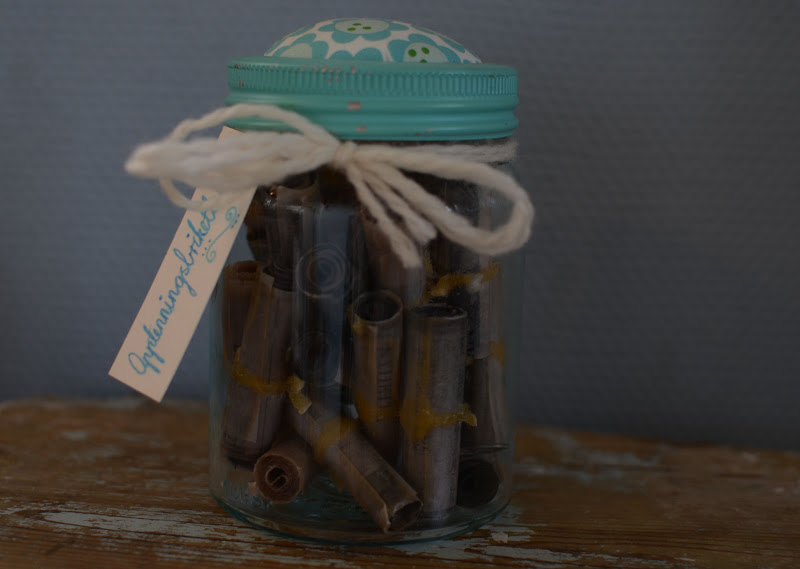 Hun rullet avispapir sammen til små ruller, og dyppet de i smeltet stearin fra lys stumper. Knøyt en sløyfe med hyssing rund før dypping for å holde de sammen. La de i gjennomsiktige glass. Veldig dekorative og samtidig anvendelige.