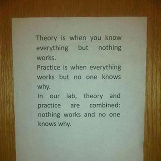Jeg trenger en figur som på en morsom måte illustrerer teori kontra praksis. En vitsefigur, lizzom. Den skal brukes foran på en presentasjon av typen [Typisk problemstilling vi har til daglig] - en praktisk tilnærmingfor ingeniører.
