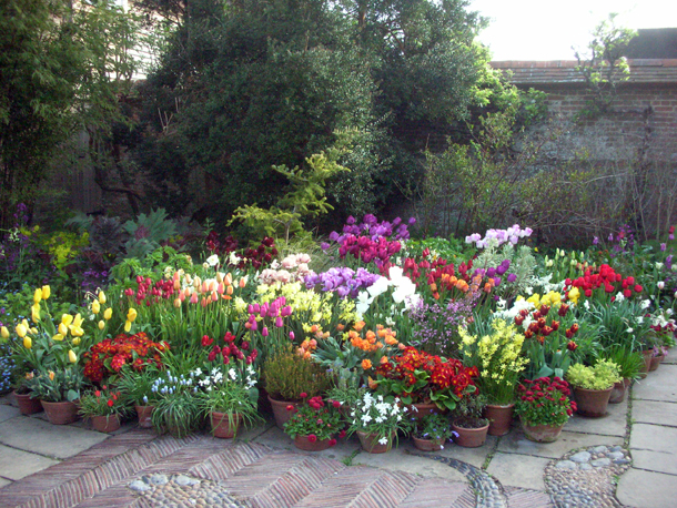 I en stor potte hadde jeg lecakuler og litt jord, store løker (høye tulipaner, keiserkrone osv), litt jord litt mindre løker (påskeliljer og kortere tulipaner), litt jord, enda mindre løker (hyasinter), litt jord, bittesmå løker (krokuser, perleblomster osv). Og i noen tok jeg bare tett med tulipaner eller en blanding av tulipaner og hyasinter eller påskeliljer og tulipaner. Alt går. Kjør på!