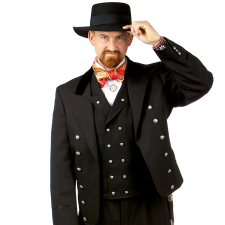 Mannen min fikk bunad av sine foreldre nå nylig, og valgte festdrakt med lang, svart jakke og nickers. Han har vest i blått som matcher (sånn noenlunde) fargen i festdrakta mi.