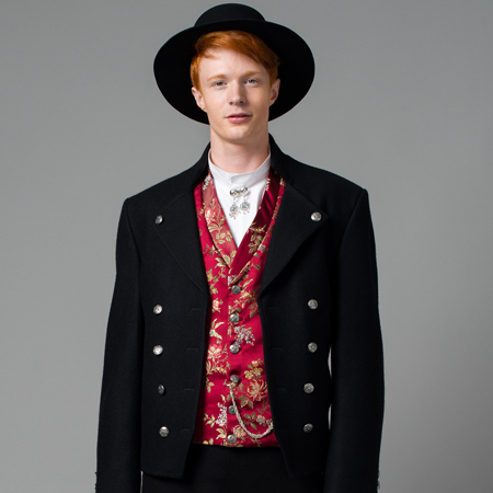 Begge er tegnet av Eva Lie. Bestill time hos henne (det er flere som jobber der, men se om du får snakket med henne) www.evalie.no/ En samtale koster selvsagt ikke noe som helst. Om det ikke er så viktig at det er en bunad, uten kan være en festdrakt (som jo mange er) så kan hun være perfekt, tror jeg. Hun kan designe noe som passer akkurat din mann i stil og stoffer.