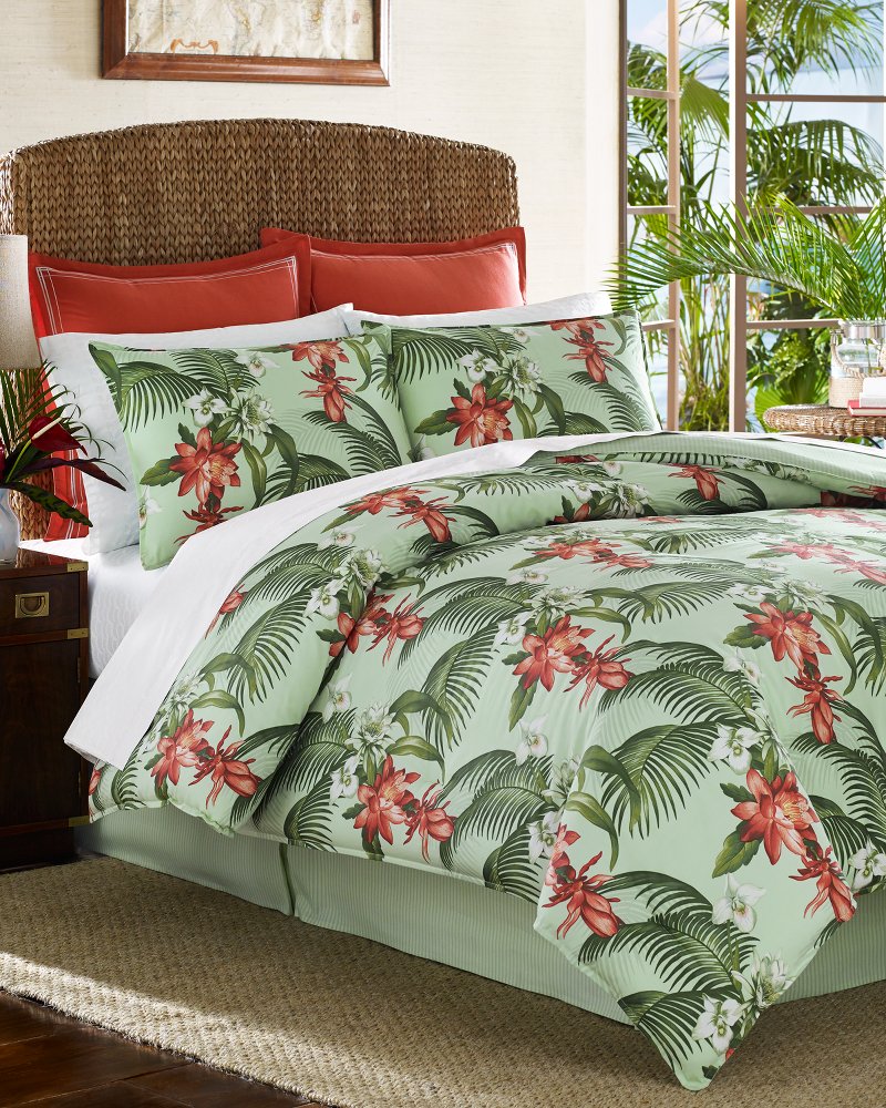 Vi går for eksotisk varme og kitsch på soverommet og har dette sengeteppet, rosa flamingoer og skittentøyskurv i bambus. Men jeg sliter med å finne en fin veggfarge til. Det kan godt bare to farger, en fondvegg og en lysere på resten, evt. en tapet på veggen bak senga.