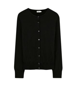 Jeg har en cardigan i ull fra Benetton som nok er fin til kjole. Kjøpte den før jul så den er nok i utvalget fortsatt. Den har rund hals og sorte knapper. Jeg har i litt dyp grønn men den finnes i mange flotte farger og helt sikkert i sort.