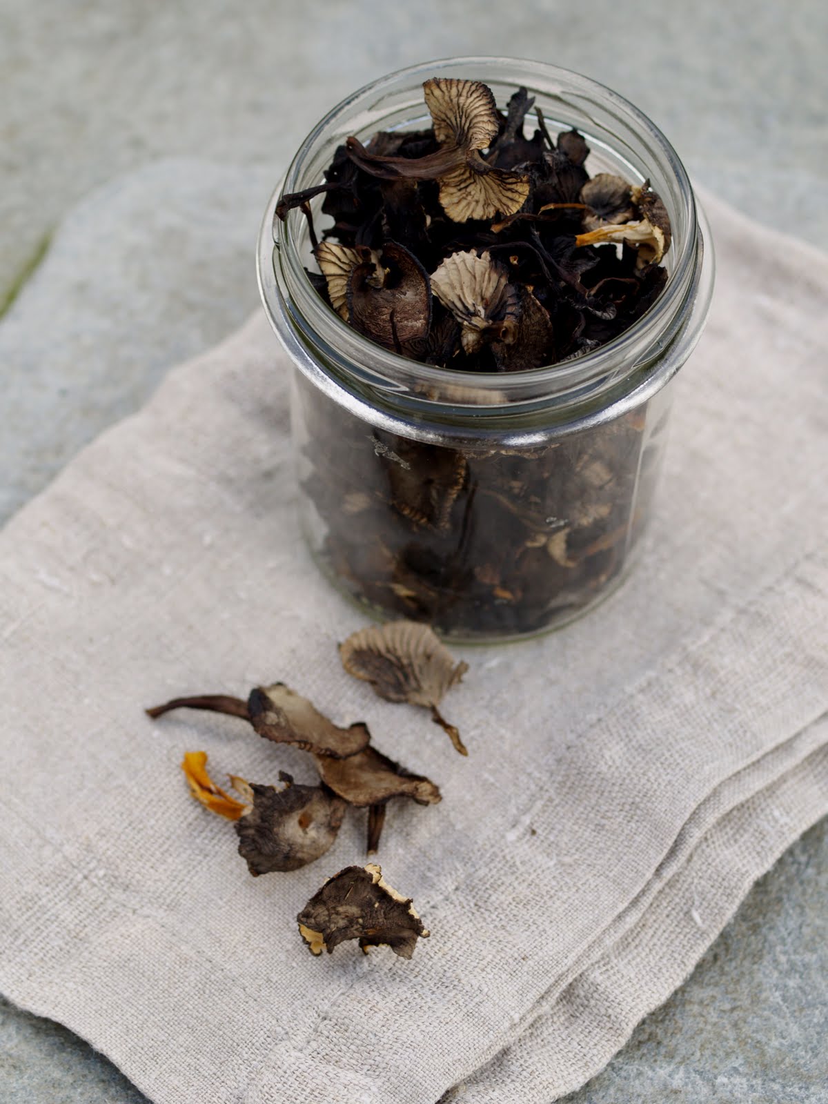 Det bugner av traktkantareller i skogen nå. De er veldig enkle å tørke, bare rens dem og legg den på en avis et sted. Legg på glass, og du har flotte julegaver.