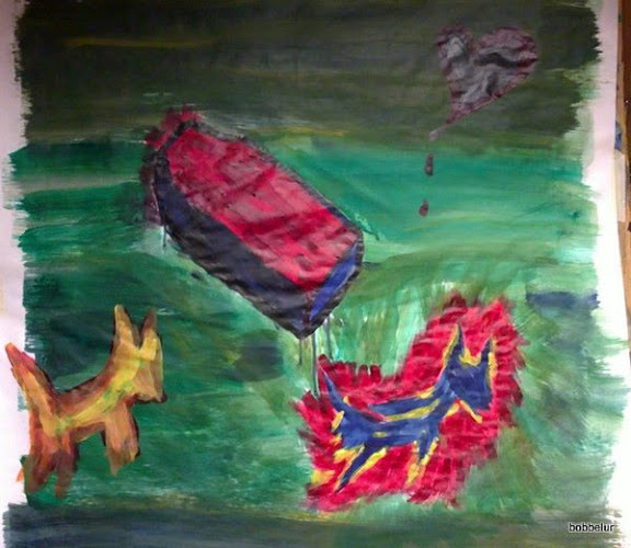 Det gikk greit å se bildet om igjen, og jeg skal ta vare på det til senere. Bildet fra i dag er mer 'pent og pyntelig', men fylt av symboler siden det var symboler vi skulle male. Jeg skal gruble litt mer over hvordan jeg har plassert dem og hva de betyr, for jeg ser det er mye som stemmer ut i fra hva læreren sa om tolkningen. Dette er spennende saker!