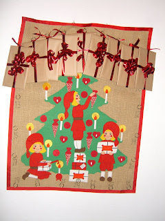Her er min egenkomponerte julekalender. (Ikke det beste bildet, tatt med mobilkamera i dårlig lys.) De må dele, så de får hver tredje dag. Første, tjuetredje og tjuefjerde får de samlegave. Den henger i åpningen mellom stuene.