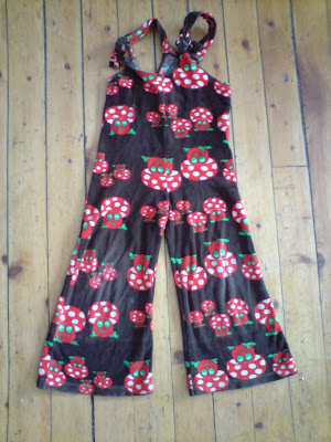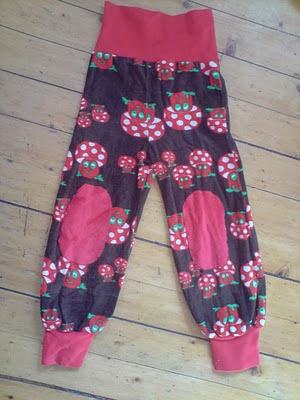 Men så var det yndlingsbuksa mi fra den gangen jeg sprang rundt og var liten.... den var bare SÅ kul i utgangspunktet! Brun velur med sopp. Men akk - selebukse, som ingen av mine unger vil gå i. Det var jo litt leit da - jeg hadde allerede prøvd å presse den på to av ungene. Nå var det to igjen som kunne passe den, før den måtte ligge en generasjon og vente på ny mulighet.