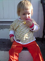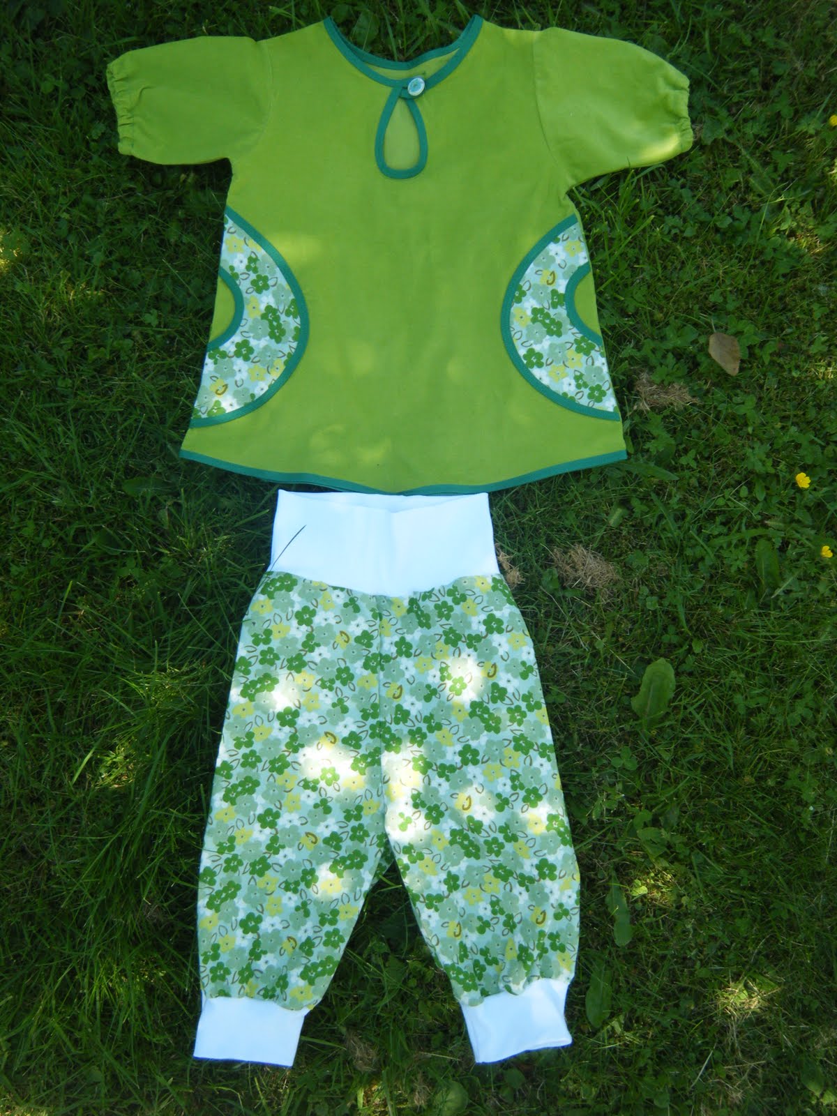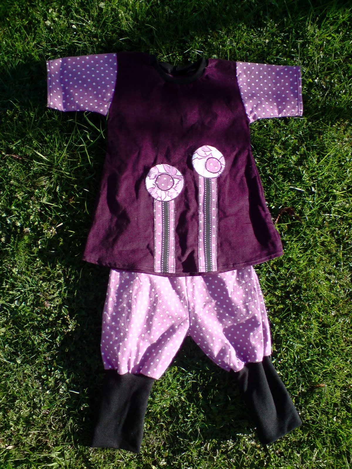 Omsider fikk jeg realisert det over i et plagg, og dette settet så dagens lys. Det er sydd av overnevnte superfine vintage stoff og brun cord fra Stoff og Stil. I halsen er det stoff fra et annet gammelt sengetøy.