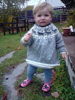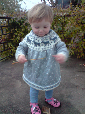Men så, etterhvert som det balla på seg, ble det mer fra butikken og mindre fra meg. Punktum har så langt ikke fått et eneste strikkaplagg fra meg, men ENDELIG er reinsdyrkjolen ferdig. Passa perfekt.