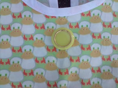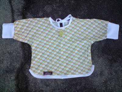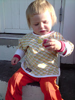 I det jeg hadde sydd den fast, innså jeg at der kom den ikke til å være lenge. Den er ikke sydd på dobbelt stoff, og selv om det bare er en pynteknapp bør den være det. Særlig når den pryder fronten til en ettåring :knegg:. Jeg skal sprette den av, og finne på noe annen pynt.