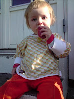 Tunika og kortbukser til Rusket. Egentlig skulle det være en str. 6-8 år, men etter å ha gjort en variant av mitt vanlige stunt - denne gangen la jeg tøyet vrang mot vrang og sydde, i stedet for rett mot vrang som jeg bruker - ble den en størrelse mindre gitt. Hun får det på seg da, men det varer ikke to sesonger.