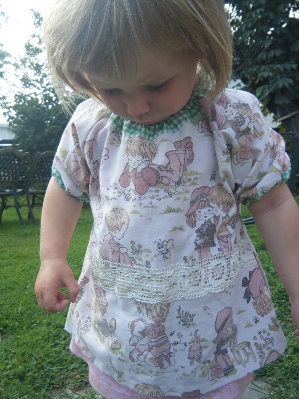 Et gammelt sengetøy som har holdt ei lita jente varm om natta, har blitt en lett sommerbluse som ei anna lita jente kan få gå med det om dagen.