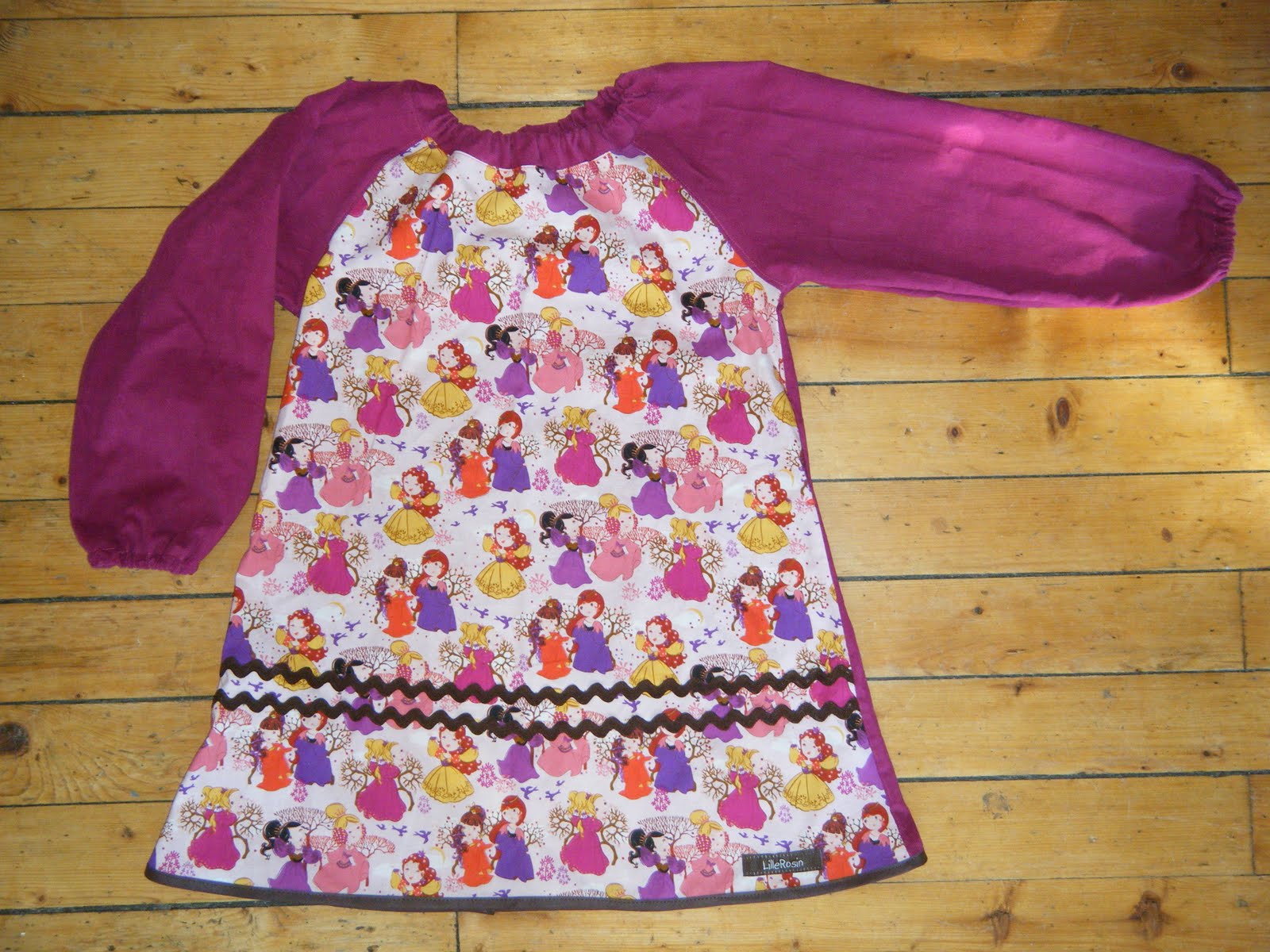 Skikkelig prinsessekjole dette her, med maaange småprinsesser. Synes dette stoffet er helt fantastisk. Bakstykke og ermer er i mørk rosa. Kjolelengden er i str. 110. Ermene er ganske lange - strikk nederst, slik at de kan brukes av en femåring. Men de burde holde opp til 6, kanskje 7, år. Da blir det tunika. Klær skal kunne brukes lenge, synes jeg.