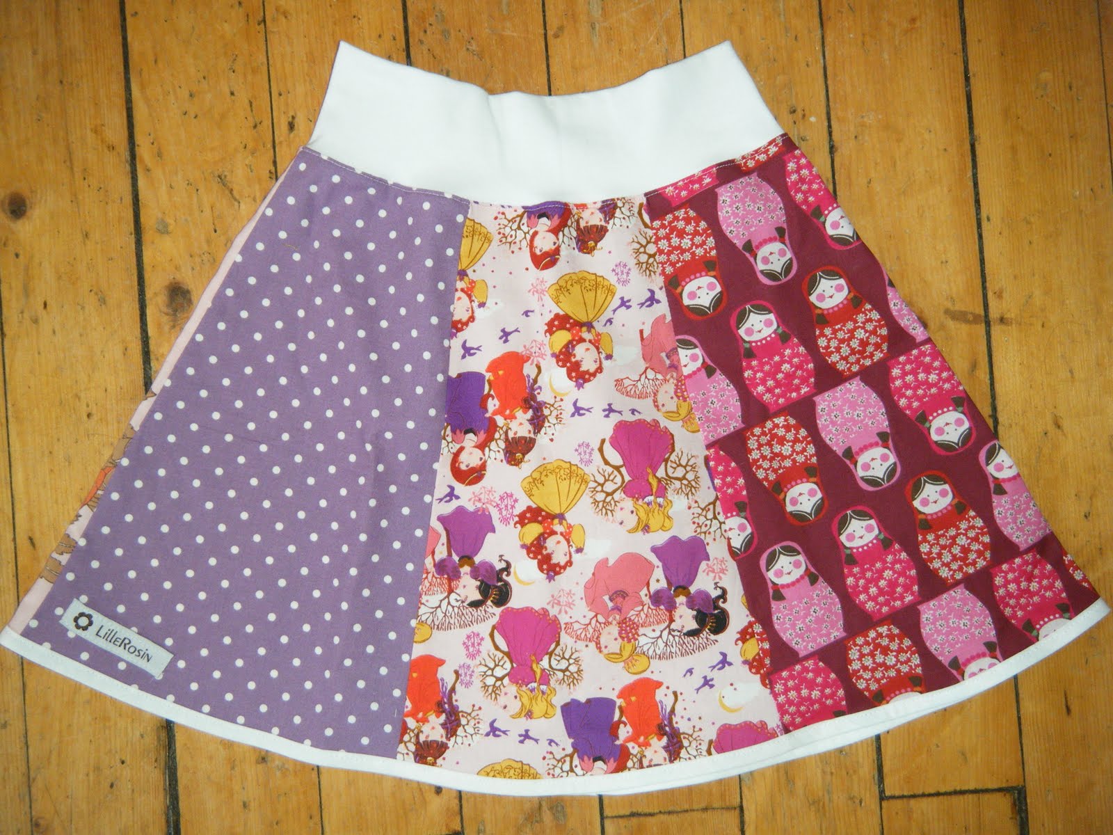 Jeg skal være med på mitt aller første marked (Husflidens kjipe julemarked gjelder ikke), og prøver desperat å sy opp litt til det. Disse skjørtene er enkle å sy, man får brukt en del rester (som jeg har masse masse av), og så er de så fine! Lette å ta på, lette å snurre rundt med. Dette er førsteskjørt ut, i størrelse 4-6 år sånn ca. Det ble kanskje litt bredt i linningen, så der skal jeg finne på noe.