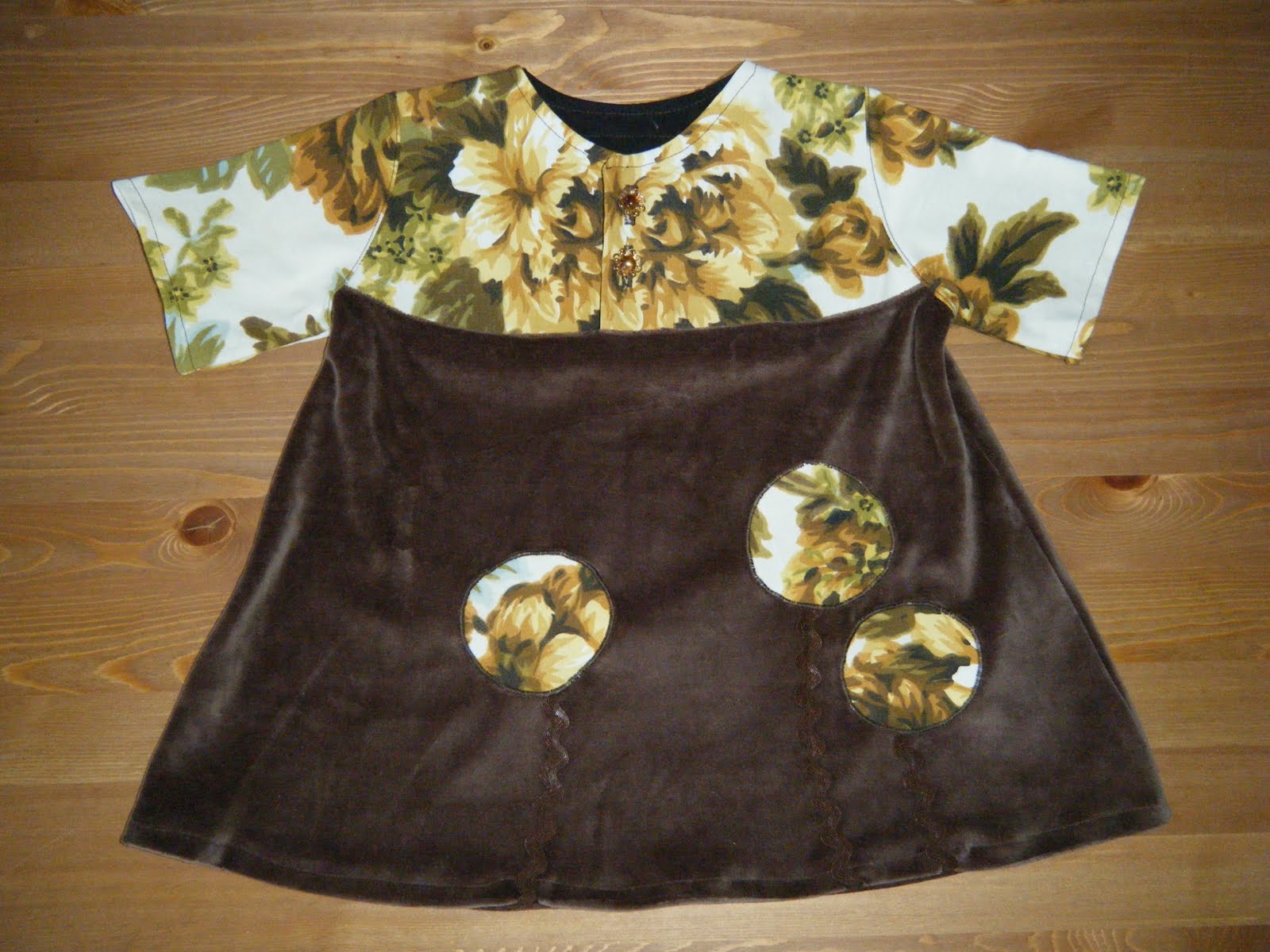 En søt tunika i babycord og vintage Holly Hobbie- sengetøy. Jeg har lagd mange av denne varianten, og ble litt for eplekjekk. Med fullt trykk på ovelock-pedalen da jeg sydde på halskanten, ble det en liten brett i stoffet på forstykket. Grrrrrr, men jeg skjulte den mesterlig med en liten hekla blomst.