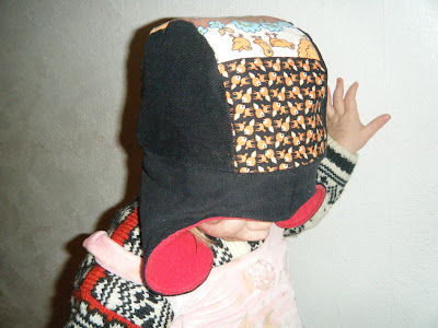 Her er Punktum modell for første forsøk. Jeg tror jeg muligens skal gjøre noe med klaffene, ellers ble jeg riktig fornøyd. Det svarte stoffet er cord, mens stripa på midten er restestoffer i bomull. Fora med fleece, slik at den er varm og god.