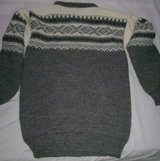 Jeg synes den blå originalen er skikkelig fin. Selv har jeg en med rød bunnfarge og koksgrått der det er rødt i originalen. Det mangler bare å montere ermene og strikke halskant, det har det gjort i noen år nå. :sparke: