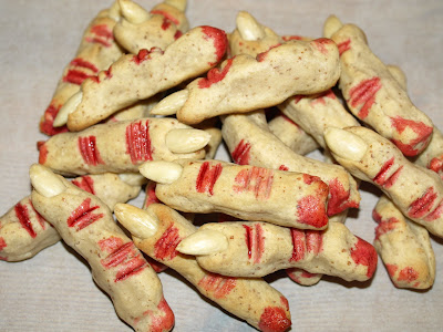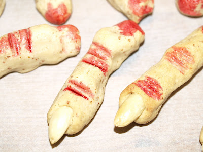 Tenkte jeg skulle prøve meg på disse avkuttede heksefingrene HER også. Det ser da vitterlig ut som kransekakedeig, mandler og litt rød konditorfarge.