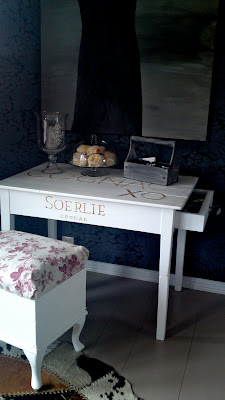Og en gammel puff som jeg har trekt om og et gammelt bord. Malte det hvitt med en cognaclogo. Vet ikke om det skal være sånn, kanskje litt kræsj med resten av møblene mine.