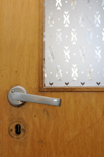 Dette er en av de få dørene i huset vi enda ikke har malt hvit, jeg bare elsker mønsteret i glasset. Hvis jeg nå klarer å finne den nøkkelhullet og får skrudd på den, blir den ferdig også, hehe.