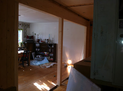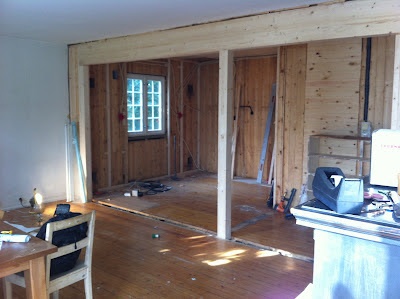 Her er samme rommet, bildet tatt fra trappa. Vi har lagt nytt gulv, byttet et vindu og satt gips på veggene. Vannbåren varme i gulvet. Mangler litt lister og sånt, og å sette inn et enkelt hybelkjøkken (vi har det stående i bua), men ellers ganske ferdig.