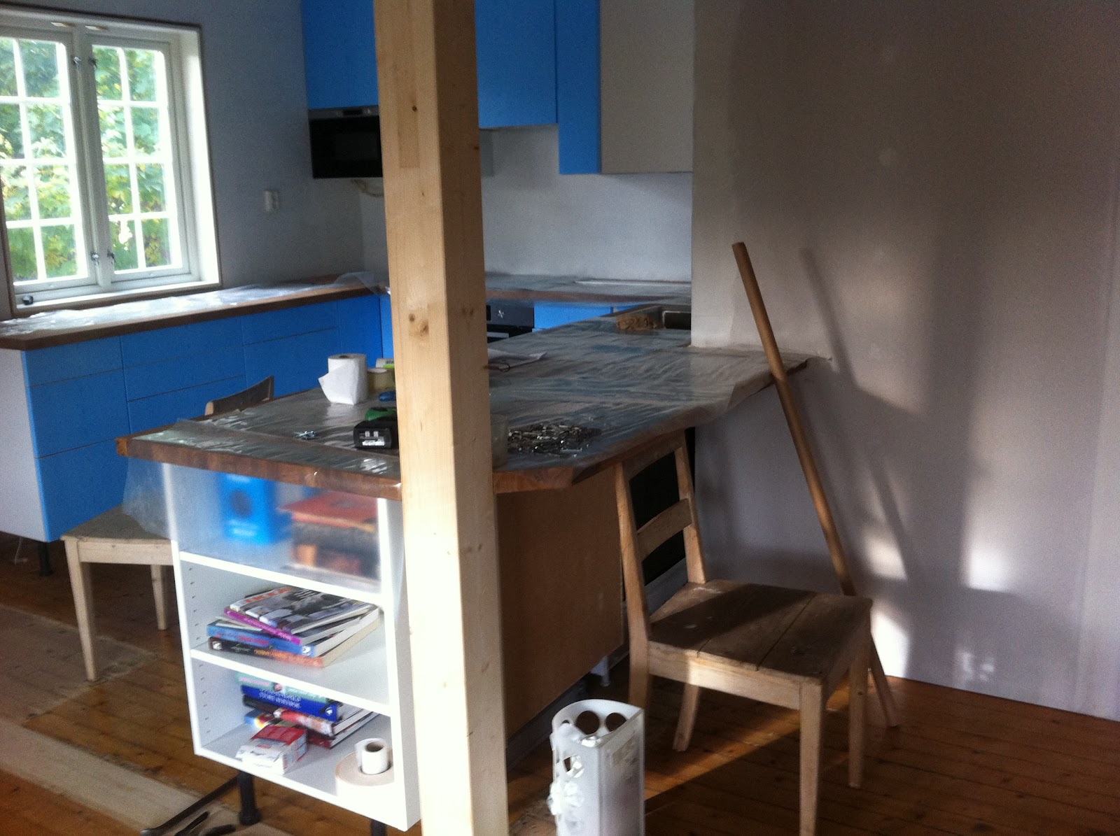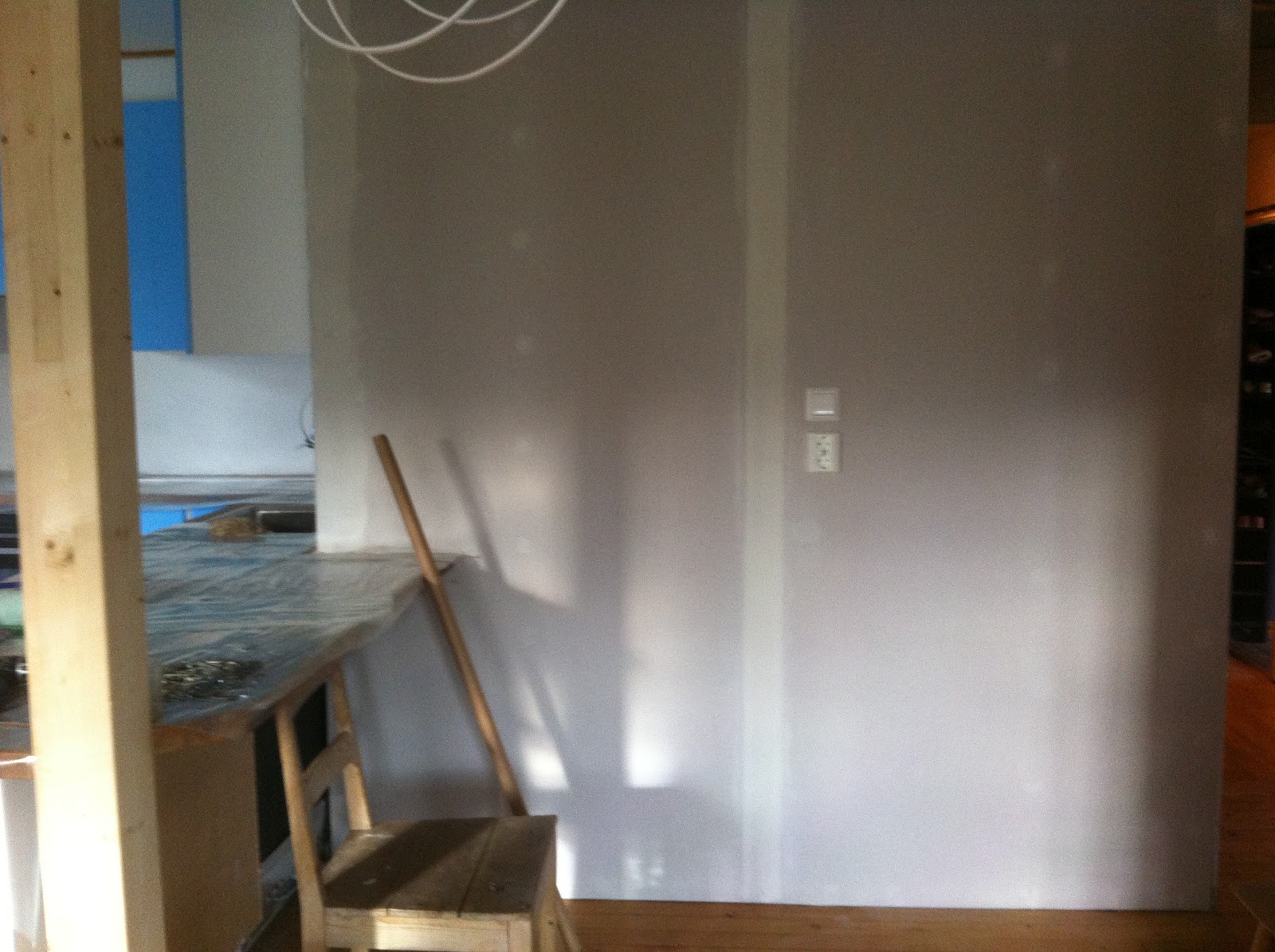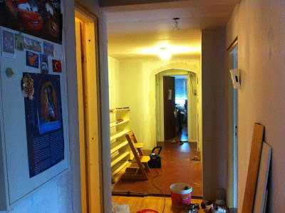 Og så litt gangprat. Vi har som nevnt revet en vegg. Det er fantastisk! Jeg visste det gamle lille trange kjøkkenet irriterte meg, men jeg ante ikke hvor forbanna jeg egentlig var over den lille gangen. Det å kunne ta på seg sko uten at noen kræsjer inn i bakpartiet slik at man tipper over og lander med nesa i de våte støvlene til Skatten, er heeeelt fantastisk!