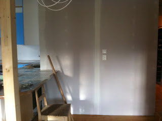 Nå har vi bevegd oss til enden av gangen, og kikker inn i det som var en ekstrastue. Det skal det forsåvidt bli nå også, men jeg skal ha mitt arbeidssted der. Planen er stort arbeidsbord, og en liten salong der unger og gjester og de som vil kan sitte. Til nå har jeg hatt symaskin i kjelleren, og det er skvett umulig å snike seg unna mer enn 30 sekunder før noen roper.