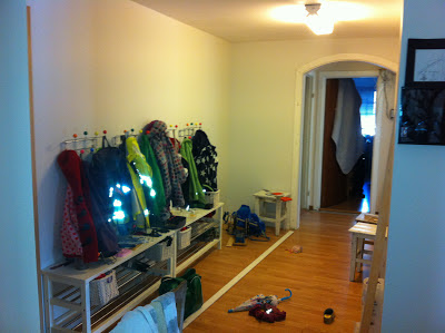 [LEFT]Tanken var at ungene skulle ha benker de kunne sitte på, men jeg har hengt knaggene for lavt. :gaah: Ikke f... om jeg sparkler og maler den veggen en gang til, så når jeg på et tidspunkt flytter knaggene opp, vil det bli hull under. Jada. Satser på at det vil være nok jakker slik at hullene ikke synes. Tror ikke det blir noe problem i grunnen.[/LEFT]