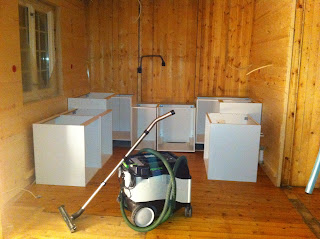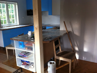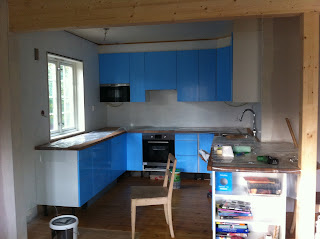 .... og satt opp! Vel, i hvert fall nesten. Det mangler foring (?) under skapene, og det er en elektrikerjobb igjen. Tak må også sparkles og males, og så må vi male veggene og sette på plater mellom benken og overskapene. Litt spent på når dette blir gjort, ettersom snekkeren nå har forlatt oss siden vi snart er blakke og tror vi kan gjøre resten selv.