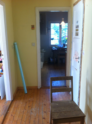 Nå har vi rundet svingen, og kikker mot kjøkkenet. Til venstre er stua, til høyre badet. Døra der skal altså blendes.